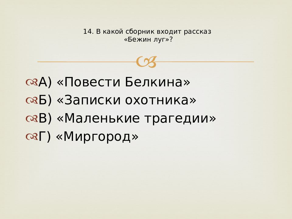 А ) «Повести Белкина» Б) «Записки охотника» В) «Маленькие трагедии» Г) «Миргород» 14. В какой сборник входит рассказ « Бежин луг»?