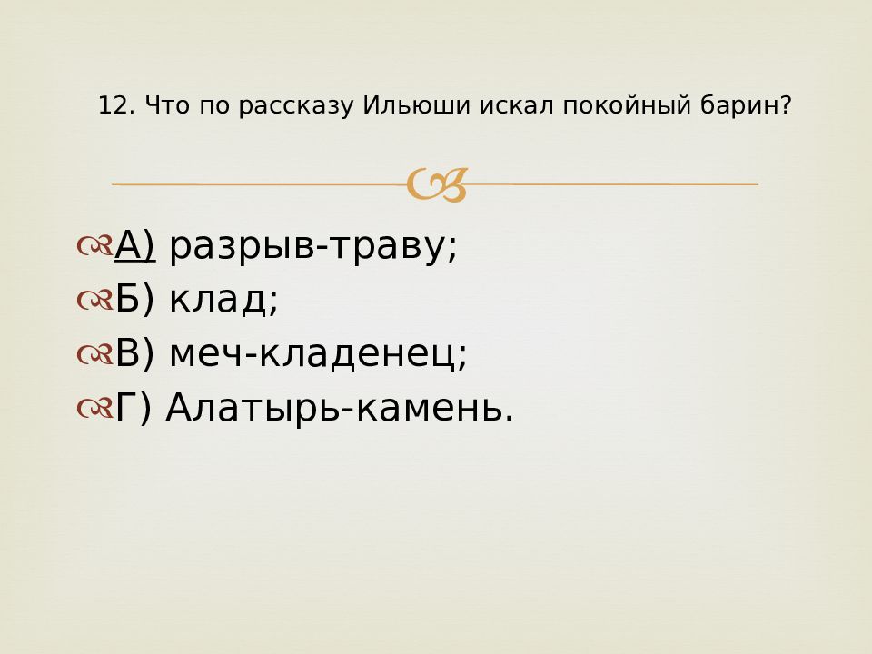 А ) разрыв-траву; Б) клад; В) меч- кладенец ; Г) Алатырь-камень. 12. Что по рассказу Ильюши искал покойный барин?