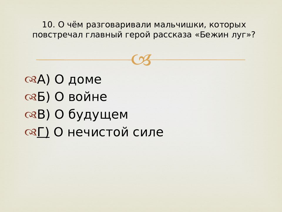 А ) О доме Б) О войне В) О будущем Г) О нечистой силе 10. О чём разговаривали мальчишки, которых повстречал главный герой рассказа « Бежин луг»?