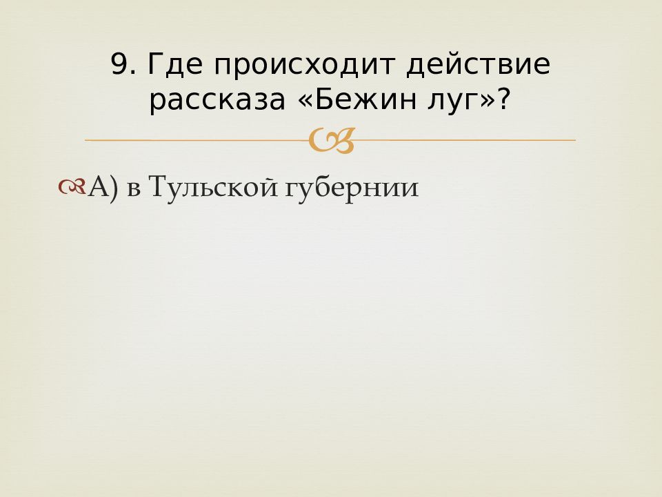 А) в Тульской губернии 9. Где происходит действие рассказа « Бежин луг»?