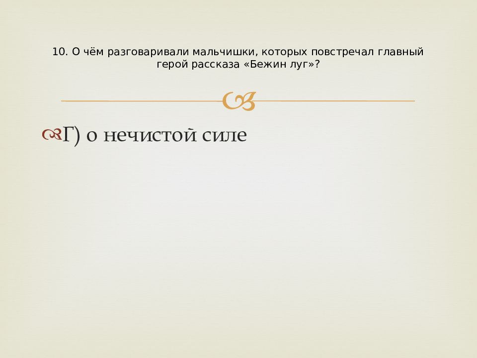 Г) о нечистой силе 10. О чём разговаривали мальчишки, которых повстречал главный герой рассказа « Бежин луг»?