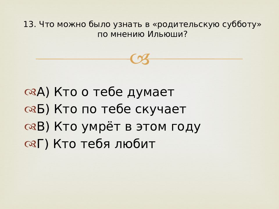А ) Кто о тебе думает Б) Кто по тебе скучает В) Кто умрёт в этом году Г) Кто тебя любит 13. Что можно было узнать в «родительскую субботу» по мнению Ильюши ?