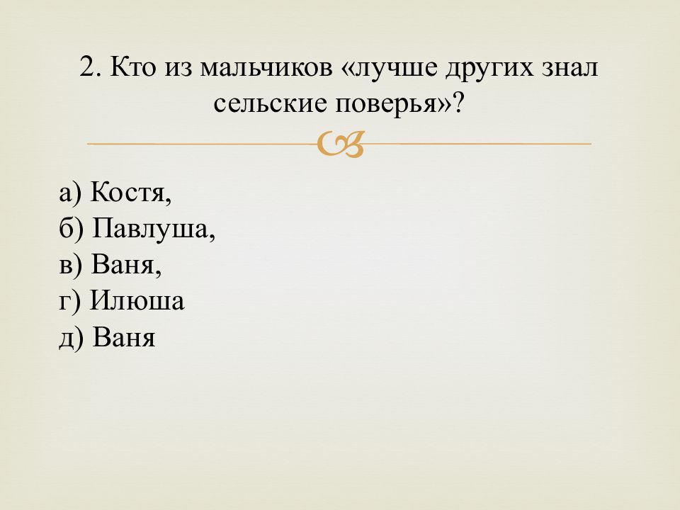 а) Костя, б) Павлуша, в) Ваня, г) Илюша д) Ваня 2. Кто из мальчиков «лучше других знал сельские поверья»?