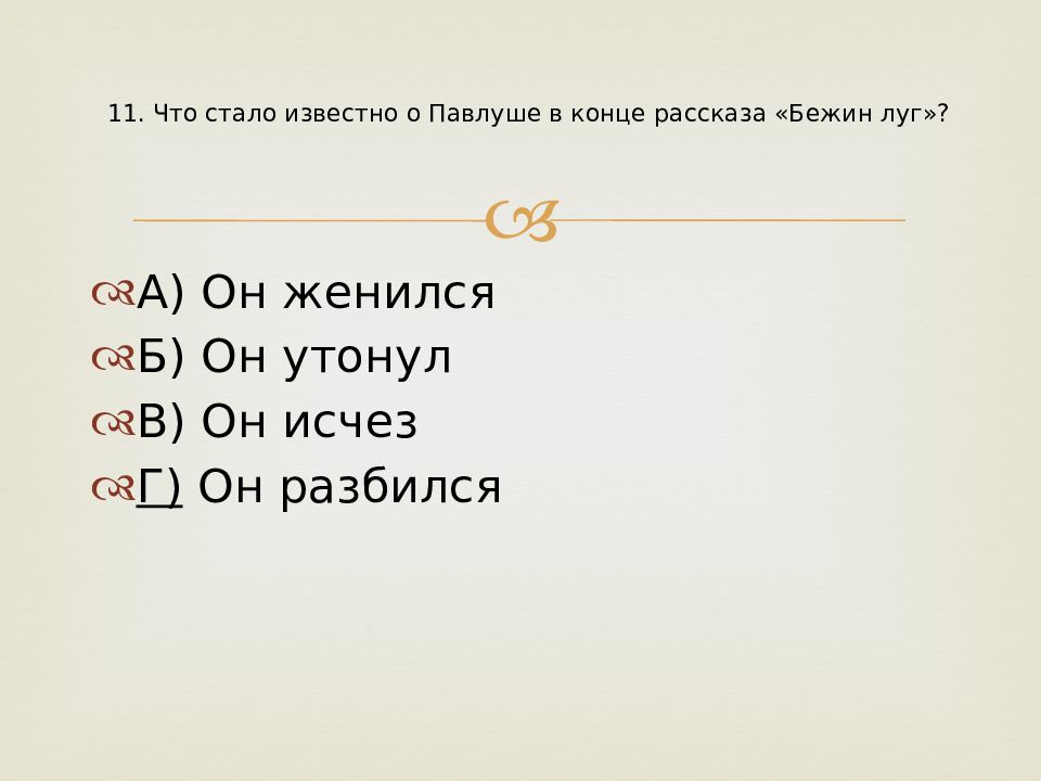 А ) Он женился Б) Он утонул В) Он исчез Г) Он разбился 11. Что стало известно о Павлуше в конце рассказа « Бежин луг»?