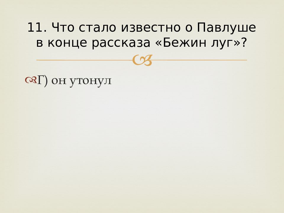 Г) он утонул 11. Что стало известно о Павлуше в конце рассказа « Бежин луг»?
