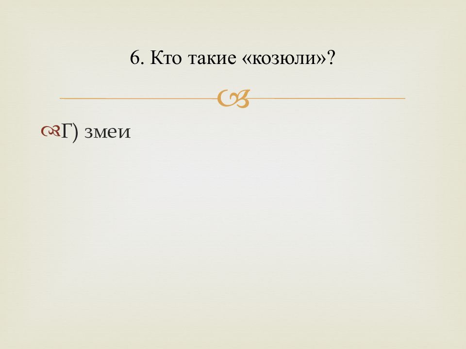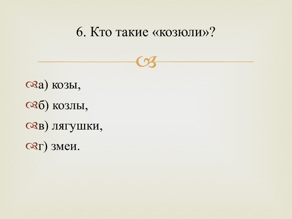 а ) козы, б) козлы, в) лягушки, г) змеи. 6. Кто такие «козюли»?