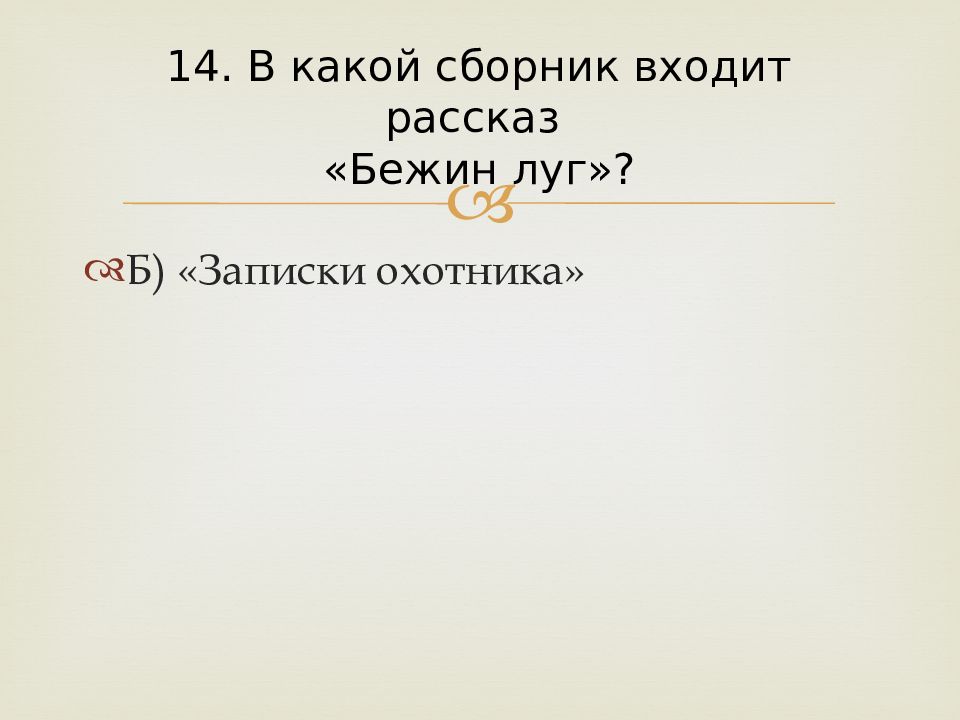 Б) «Записки охотника» 14. В какой сборник входит рассказ « Бежин луг»?