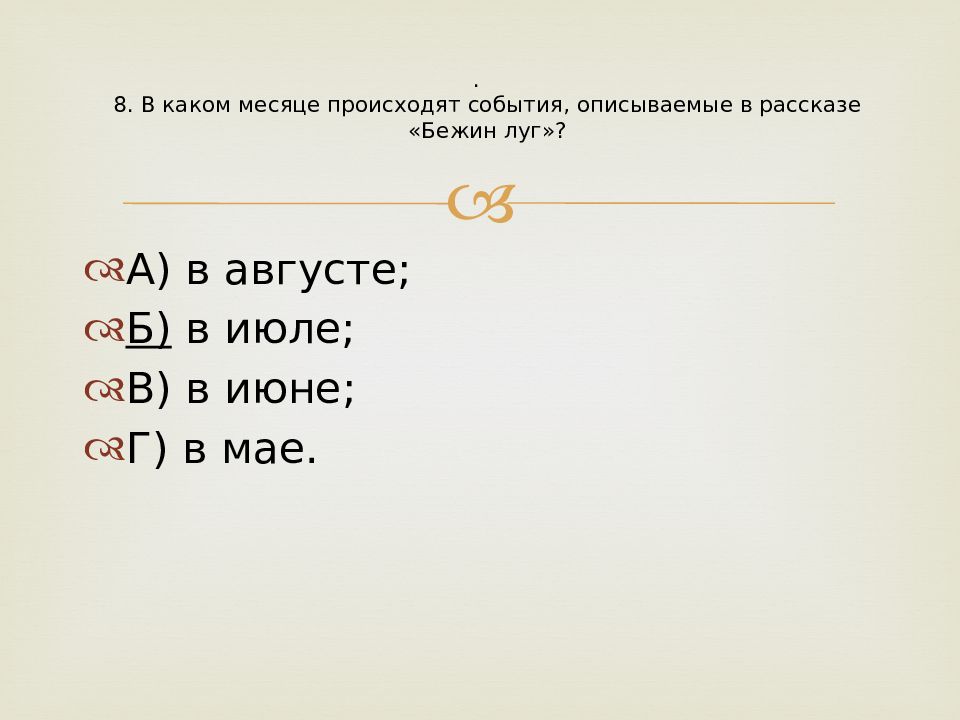 А ) в августе; Б ) в июле; В ) в июне; Г ) в мае. . 8. В каком месяце происходят события, описываемые в рассказе « Бежин луг»?