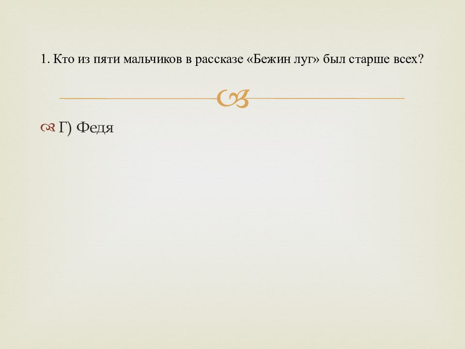 Г) Федя 1. Кто из пяти мальчиков в рассказе « Бежин луг» был старше всех?