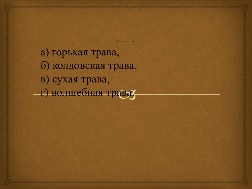 а ) горькая трава, б) колдовская трава, в) сухая трава, г) волшебная трава.