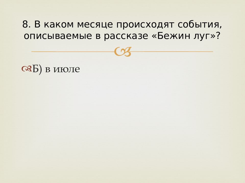Б) в июле 8. В каком месяце происходят события, описываемые в рассказе « Бежин луг»?