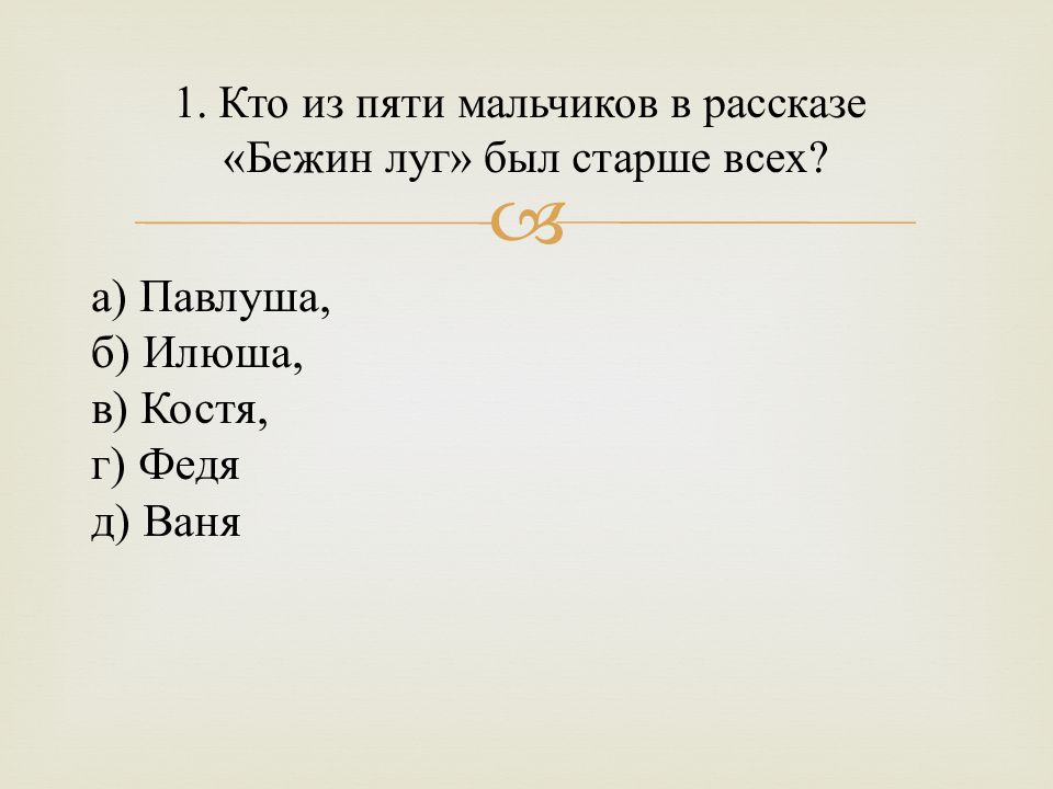 а) Павлуша, б) Илюша, в) Костя, г) Федя д) Ваня 1. Кто из пяти мальчиков в рассказе « Бежин луг» был старше всех?