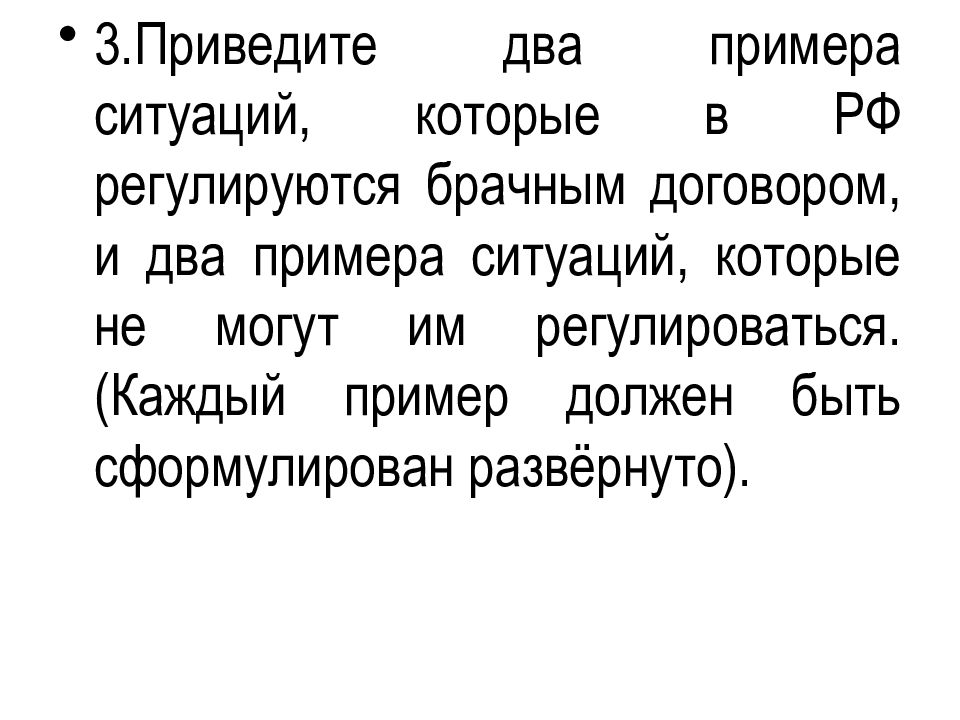 3.Приведите два примера ситуаций, которые в РФ регулируются брачным договором, и два примера ситуаций, которые не могут им регулироваться. (Каждый пример должен быть сформулирован развёрнуто).