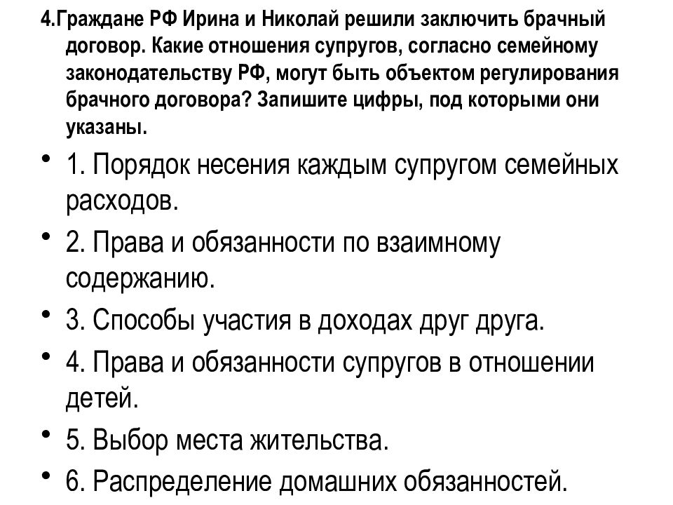 4.Граждане РФ Ирина и Николай решили заключить брачный договор. Какие отношения супругов, согласно семейному законодательству РФ, могут быть объектом регулирования брачного договора? Запишите цифры, под которыми они указаны. 1. Порядок несения каждым супругом семейных расходов. 2. Права и обязанности по взаимному содержанию. 3. Способы участия в доходах друг друга. 4. Права и обязанности супругов в отношении детей. 5. Выбор места жительства. 6. Распределение домашних обязанностей.