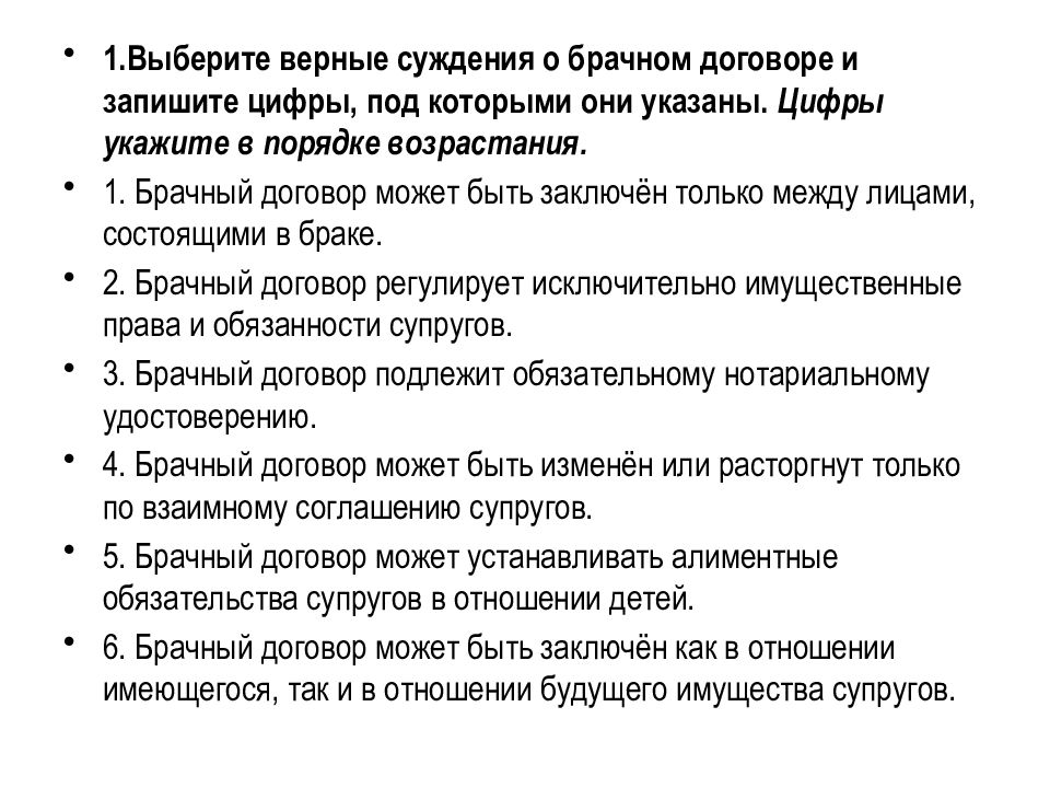 1.Выберите верные суждения о брачном договоре и запишите цифры, под которыми они указаны. Цифры укажите в порядке возрастания. 1. Брачный договор может быть заключён только между лицами, состоящими в браке. 2. Брачный договор регулирует исключительно имущественные права и обязанности супругов. 3. Брачный договор подлежит обязательному нотариальному удостоверению. 4. Брачный договор может быть изменён или расторгнут только по взаимному соглашению супругов. 5. Брачный договор может устанавливать алиментные обязательства супругов в отношении детей. 6. Брачный договор может быть заключён как в отношении имеющегося, так и в отношении будущего имущества супругов.