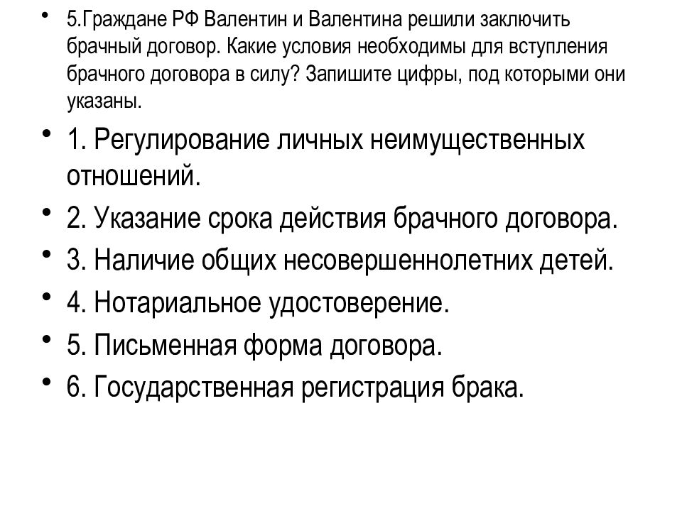 5.Граждане РФ Валентин и Валентина решили заключить брачный договор. Какие условия необходимы для вступления брачного договора в силу? Запишите цифры, под которыми они указаны. 1. Регулирование личных неимущественных отношений. 2. Указание срока действия брачного договора. 3. Наличие общих несовершеннолетних детей. 4. Нотариальное удостоверение. 5. Письменная форма договора. 6. Государственная регистрация брака.