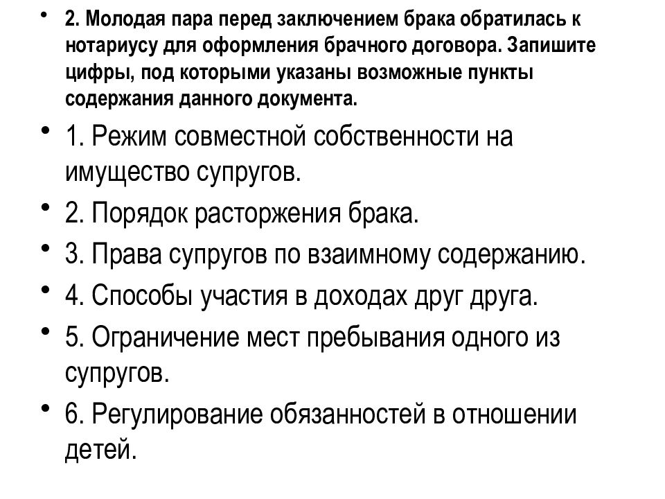 2. Молодая пара перед заключением брака обратилась к нотариусу для оформления брачного договора. Запишите цифры, под которыми указаны возможные пункты содержания данного документа. 1. Режим совместной собственности на имущество супругов. 2. Порядок расторжения брака. 3. Права супругов по взаимному содержанию. 4. Способы участия в доходах друг друга. 5. Ограничение мест пребывания одного из супругов. 6. Регулирование обязанностей в отношении детей.