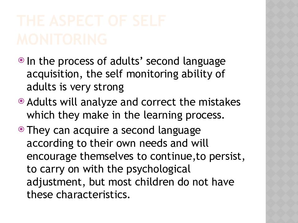 In the process of adults’ second language acquisition, the self monitoring ability of adults is very strong Adults will analyze and correct the mistakes which they make in the learning process. They can acquire a second language according to their own needs and will encourage themselves to continue,to persist, to carry on with the psychological adjustment, but most children do not have these characteristics.