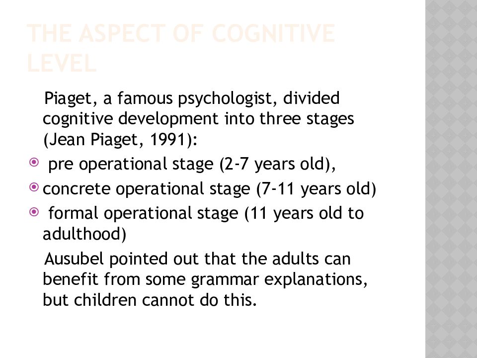 Piaget, a famous psychologist, divided cognitive development into three stages (Jean Piaget, 1991 ): pre operational stage (2-7 years old ), concrete operational stage (7-11 years old) formal operational stage (11 years old to adulthood) Ausubel pointed out that the adults can benefit from some grammar explanations, but children cannot do this.