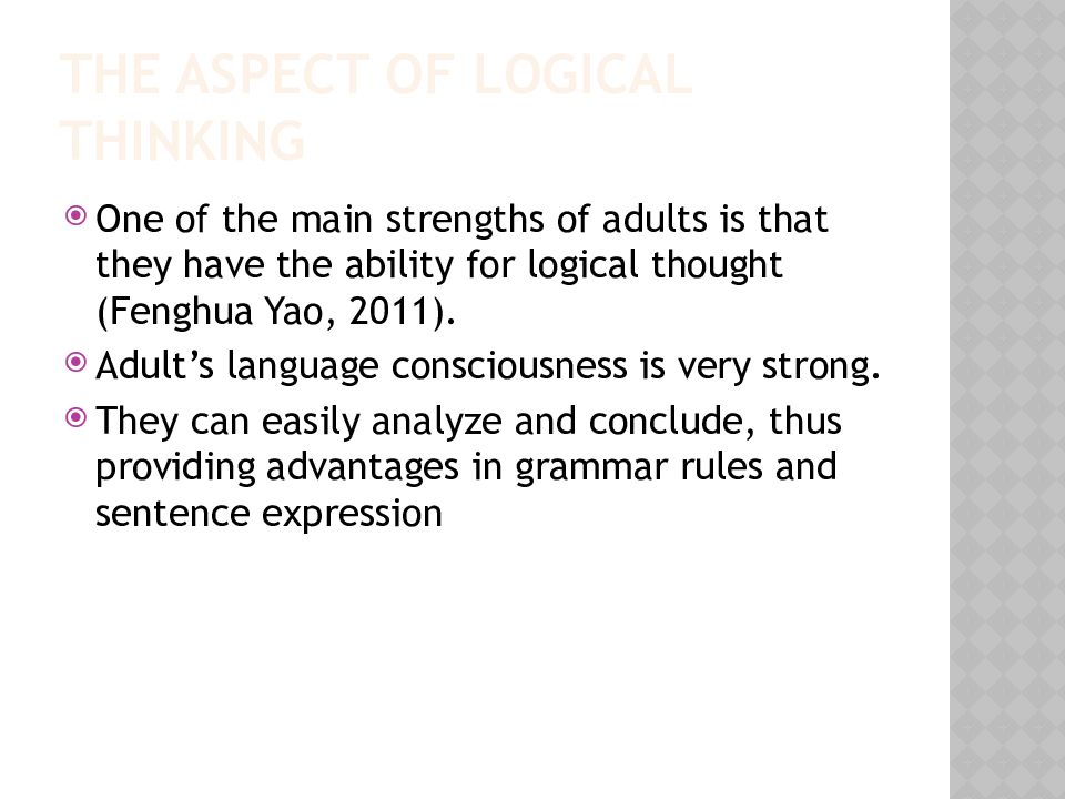One of the main strengths of adults is that they have the ability for logical thought ( Fenghua Yao, 2011). Adult’s language consciousness is very strong. They can easily analyze and conclude, thus providing advantages in grammar rules and sentence expression