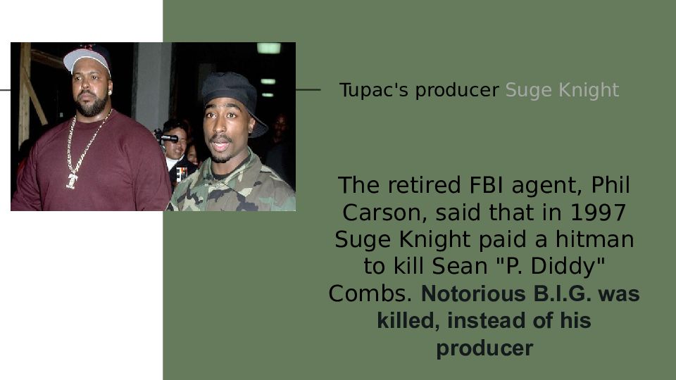 The retired FBI agent, Phil Carson, said that in 1997 Suge Knight paid a hitman to kill Sean "P. Diddy " Combs. Notorious B.I.G. was killed, instead of his producer Tupac's producer Suge Knight