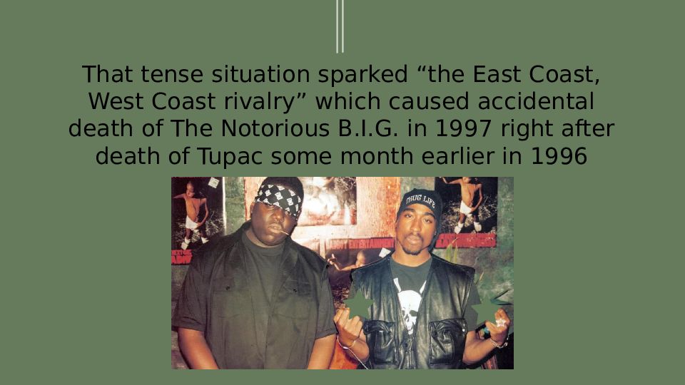That tense situation sparked “the East Coast, West Coast rivalry” which caused accidental death of The Notorious B.I.G. in 1997 right after death of Tupac some month earlier in 1996