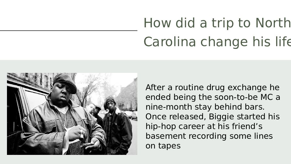 How did a trip to North Carolina change his life? After a routine drug exchange he ended being the soon-to-be MC a nine-month stay behind bars. Once released, Biggie started his hip-hop career at his friend’s basement recording some lines on tapes
