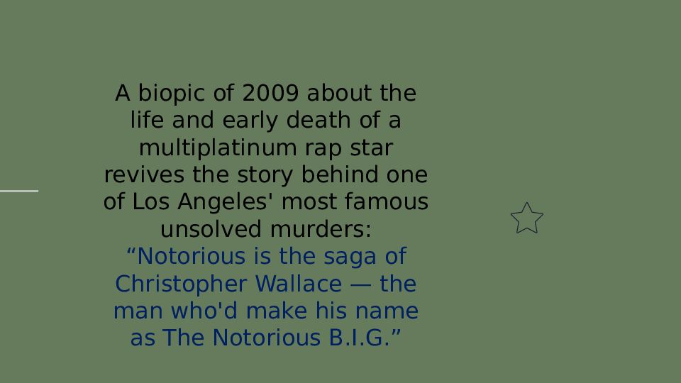 A biopic of 2009 about the life and early death of a multiplatinum rap star revives the story behind one of Los Angeles' most famous unsolved murders: “Notorious is the saga of Christopher Wallace — the man who'd make his name as The Notorious B.I.G.”