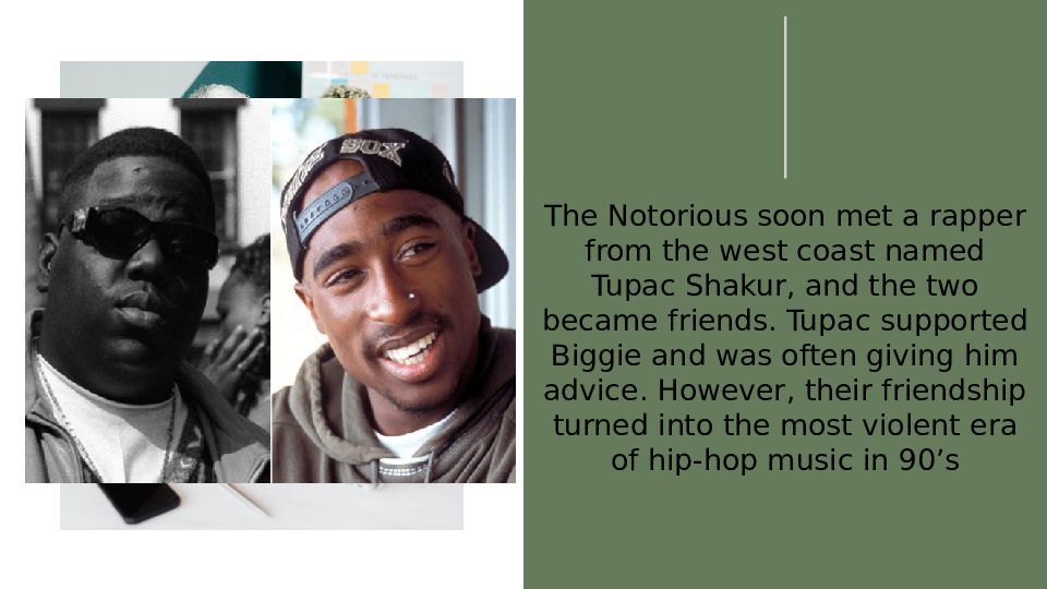 The Notorious soon met a rapper from the west coast named Tupac Shakur, and the two became friends. Tupac supported Biggie and was often giving him advice. However, their friendship turned into the most violent era of hip-hop music in 90’s