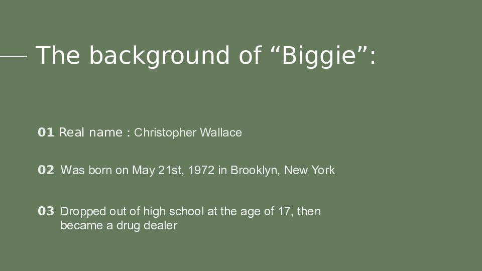 The background of “Biggie”: Real name : Christopher Wallace 01 W as born on May 21st, 1972 in Brooklyn, New York 02 Dropped out of high school at the age of 17, then became a drug dealer 03