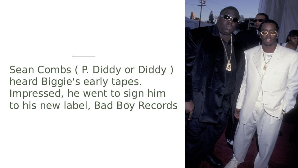 Sean Combs ( P. Diddy or Diddy ) heard Biggie's early tapes. Impressed, he went to sign him to his new label, Bad Boy Records