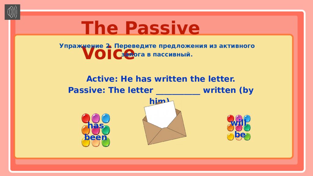 Active: He has written the letter. Passive: The letter ___________ written (by him). will be The Passive Voice Упражнение 2. Переведите предложения из активного залога в пассивный. has been