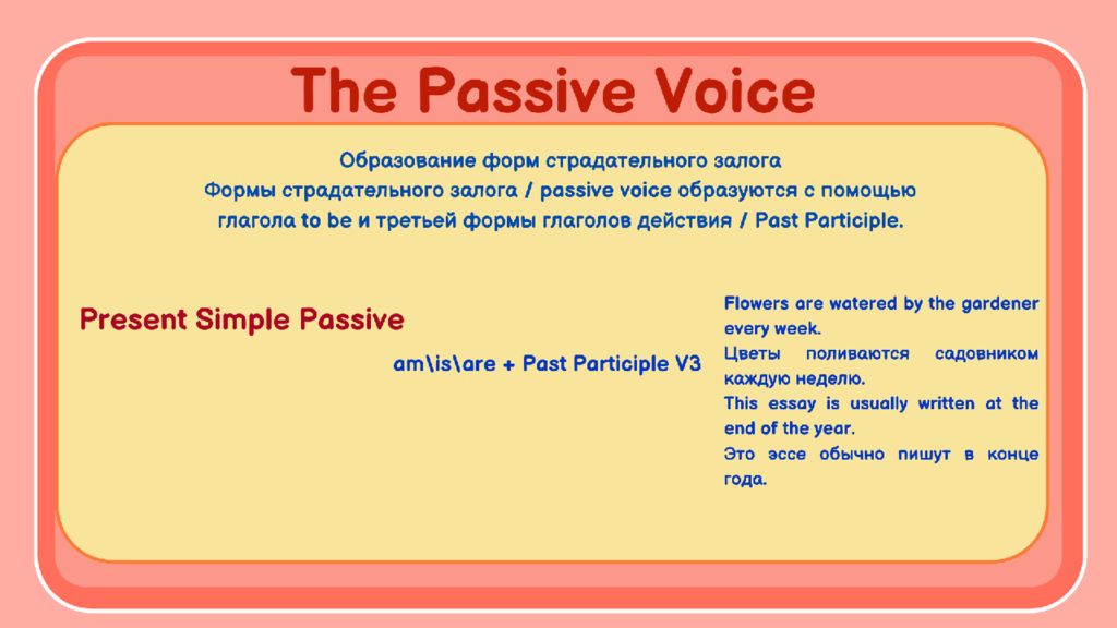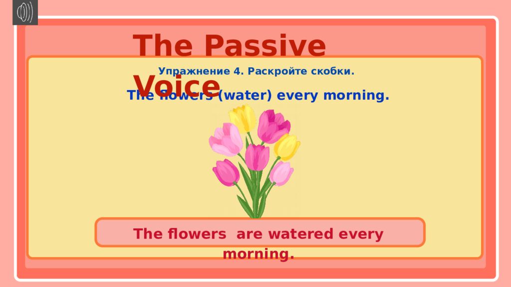 The flowers (water) every morning. The Passive Voice Упражнение 4. Раскройте скобки. The flowers are watered every morning.