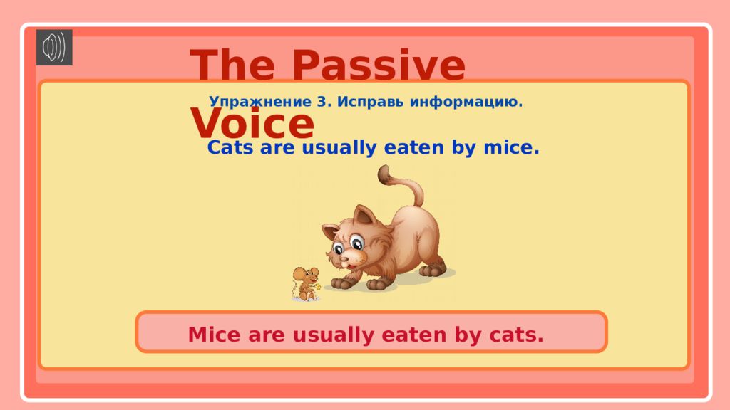 Cats are usually eaten by mice. The Passive Voice Упражнение 3. Исправь информацию. Mice are usually eaten by cats.