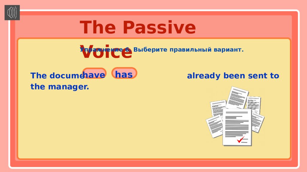 The documents already been sent to the manager. have has The Passive Voice Упражнение 6. Выбер и те правильный вариант.