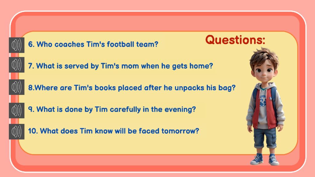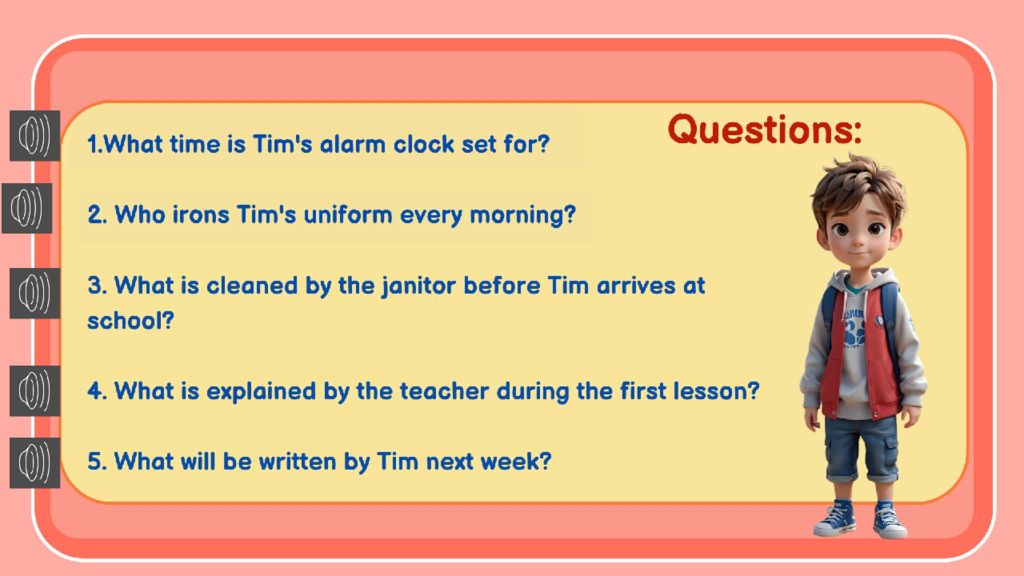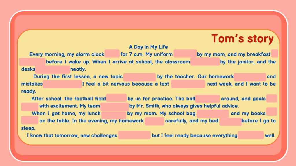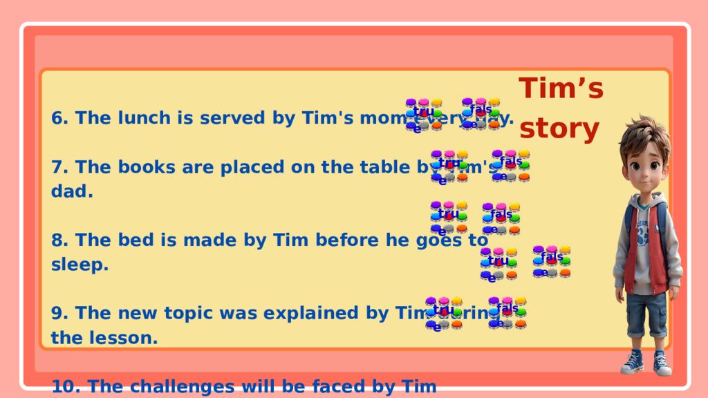 6. The lunch is served by Tim's mom every day. 7. The books are placed on the table by Tim's dad. 8. The bed is made by Tim before he goes to sleep. 9. The new topic was explained by Tim during the lesson. 10. The challenges will be faced by Tim tomorrow. true false true false true false true false true false Tim’s story