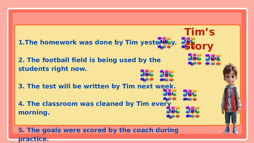1.The homework was done by Tim yesterday. 2. The football field is being used by the students right now. 3. The test will be written by Tim next week. 4. The classroom was cleaned by Tim every morning. 5. The goals were scored by the coach during practice. true false true false true false true false true false Tim’s story