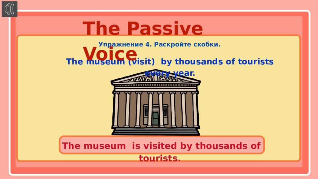 The museum (visit) by thousands of tourists every year. The Passive Voice Упражнение 4. Раскройте скобки. The museum is visited by thousands of tourists.