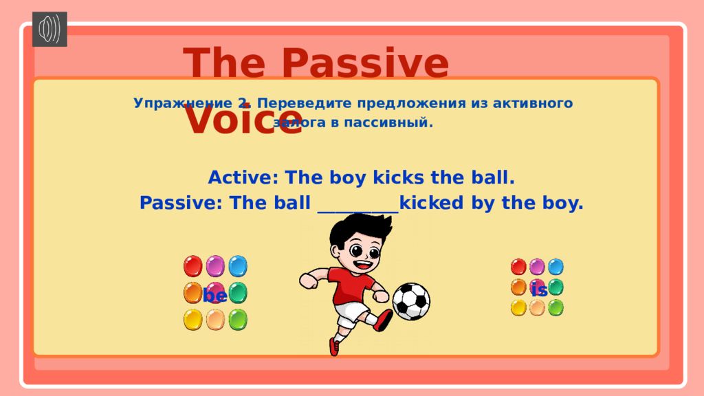 be Active: The boy kicks the ball. Passive: The ball _________kicked by the boy. The Passive Voice Упражнение 2. Переведите предложения из активного залога в пассивный. is
