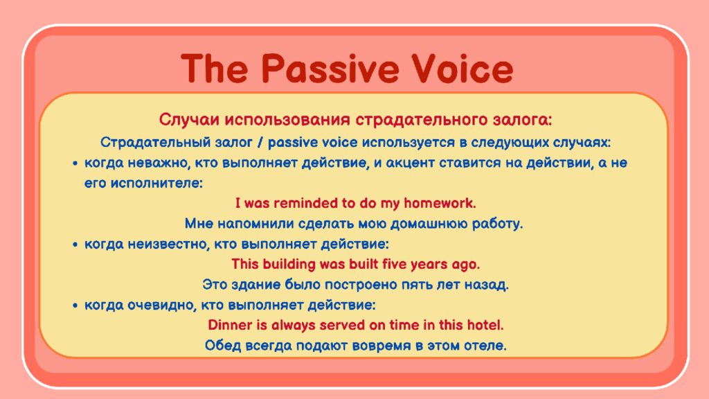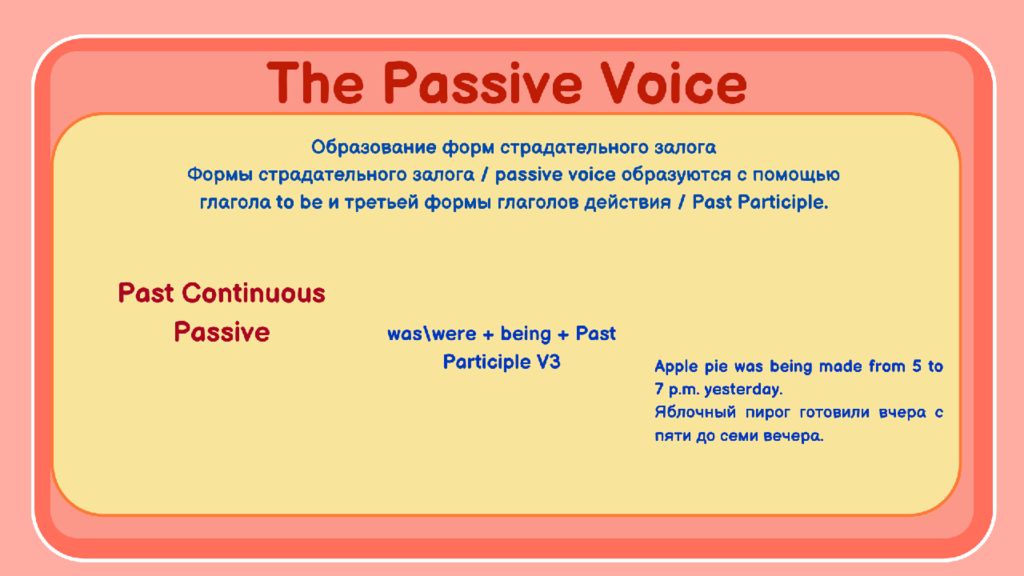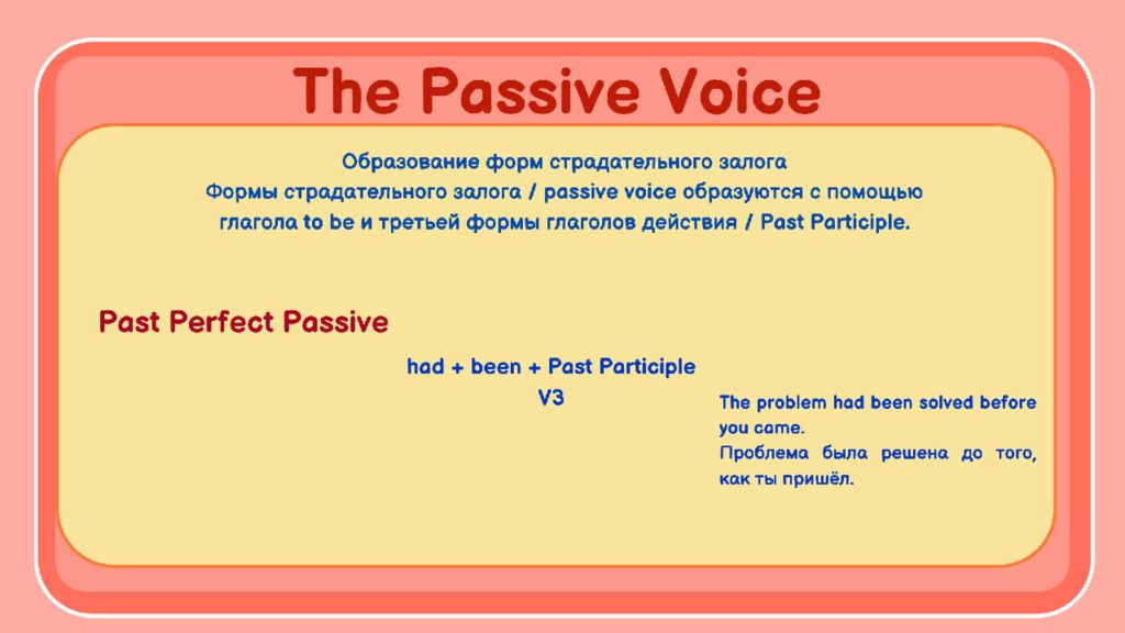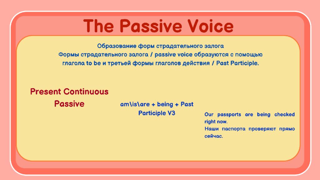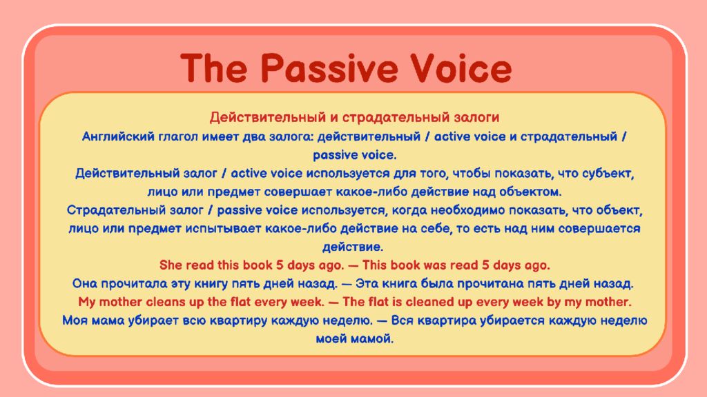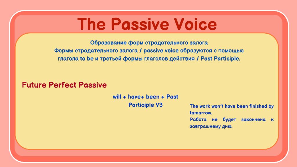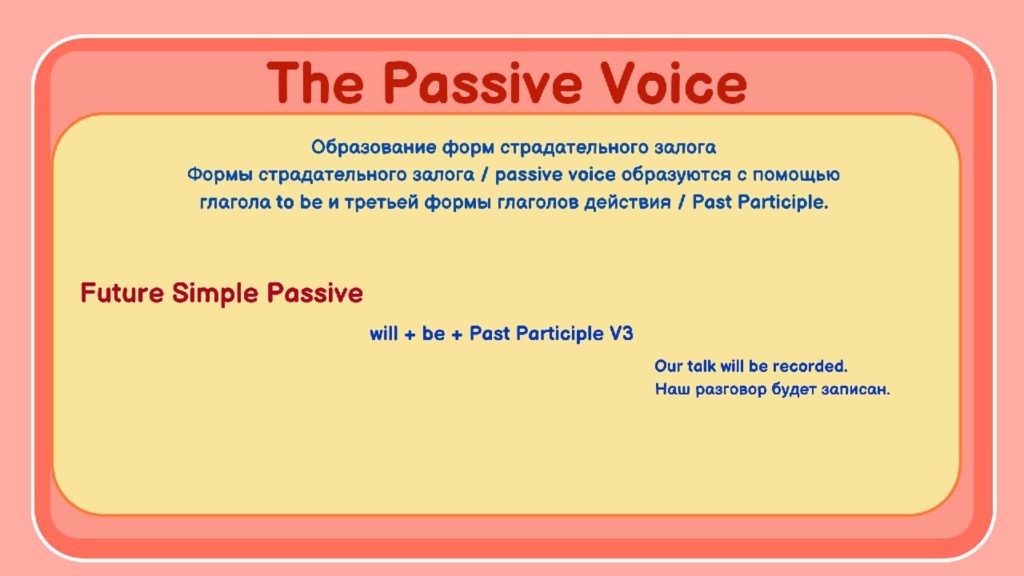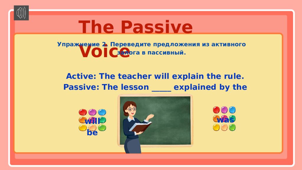 Active: The teacher will explain the rule. Passive: The lesson _____ explained by the teacher. The Passive Voice Упражнение 2. Переведите предложения из активного залога в пассивный. was will be