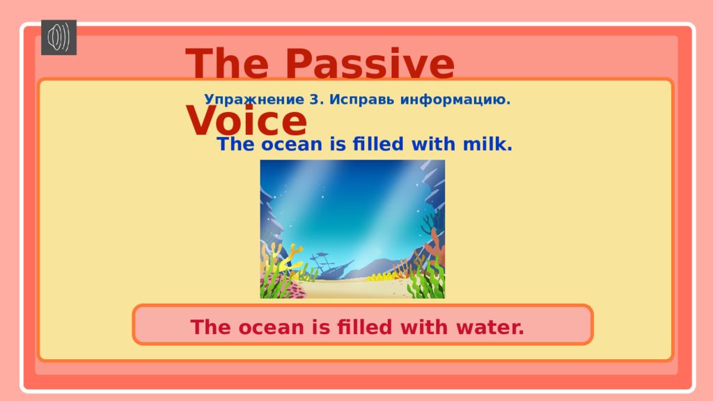 The ocean is filled with milk. The Passive Voice Упражнение 3. Исправь информацию. The ocean is filled with water.