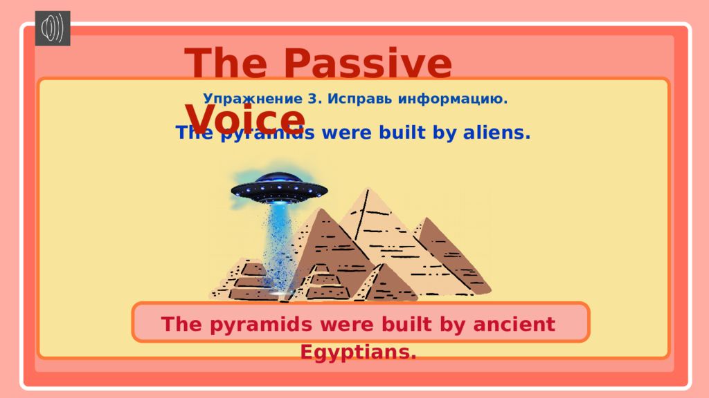 The pyramids were built by aliens. The Passive Voice Упражнение 3. Исправь информацию. The pyramids were built by ancient Egyptians.