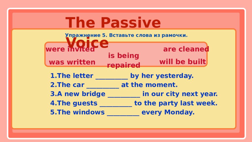 The letter __________ by her yesterday. The car __________ at the moment. A new bridge __________ in our city next year. The guests __________ to the party last week. The windows __________ every Monday. The Passive Voice Упражнение 5. Вставьте слова из рамочки. were invited is being repaired are cleaned was written will be built