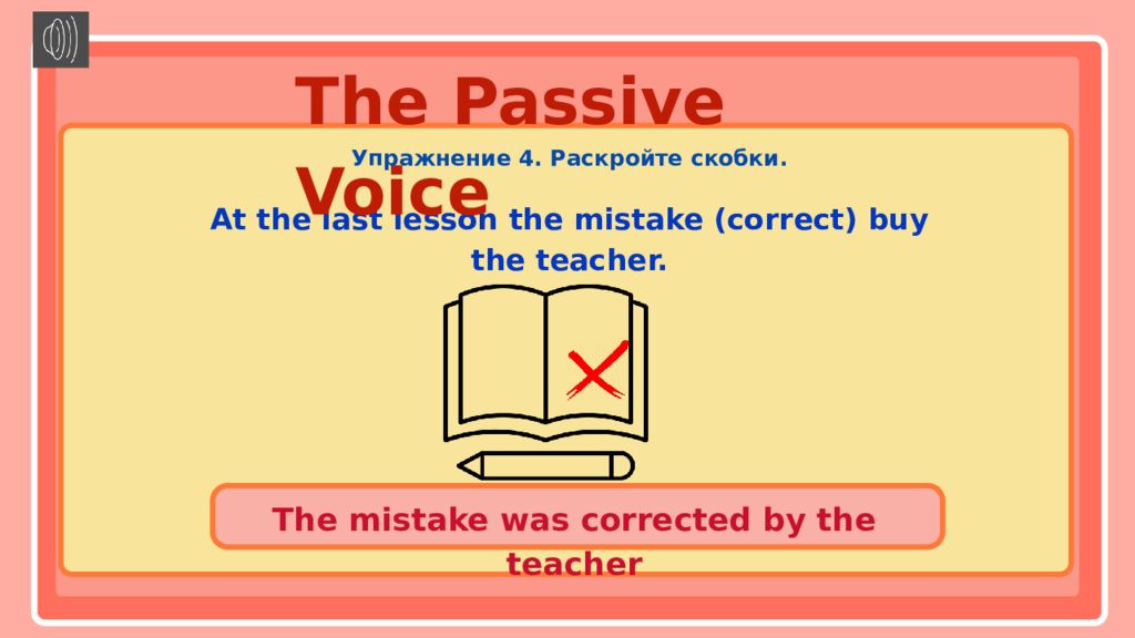 At the last lesson the mistake (correct) buy the teacher. The Passive Voice Упражнение 4. Раскройте скобки. The mistake was corrected by the teacher