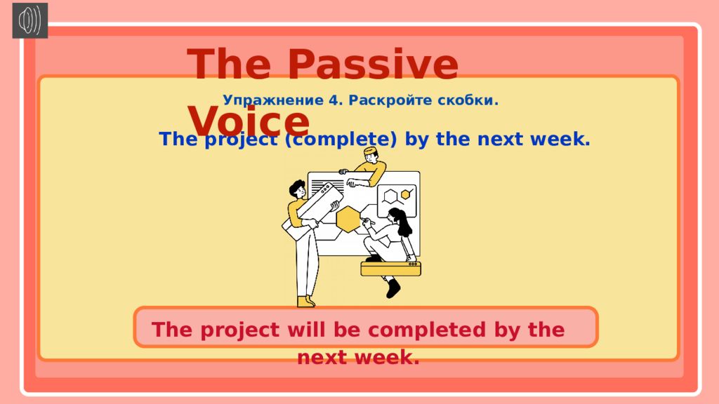 The project (complete) by the next week. The Passive Voice Упражнение 4. Раскройте скобки. The project will be completed by the next week.