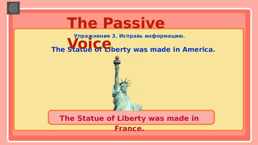 The Statue of Liberty was made in America. The Passive Voice Упражнение 3. Исправь информацию. The Statue of Liberty was made in France.