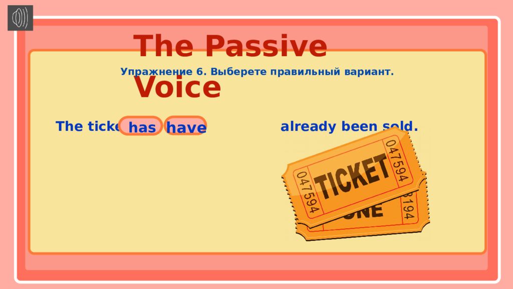 The tickets already been sold. has have The Passive Voice Упражнение 6. Выберете правильный вариант.