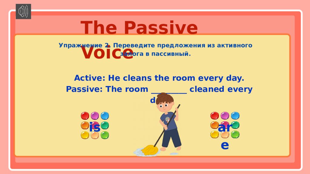 Active: He cleans the room every day. Passive: The room _________ cleaned every day. is are The Passive Voice Упражнение 2. Переведите предложения из активного залога в пассивный.