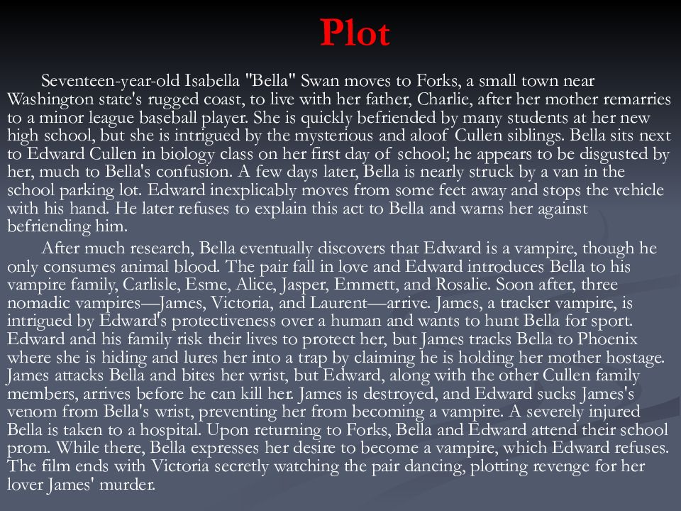 Seventeen-year-old Isabella "Bella" Swan moves to Forks, a small town near Washington state's rugged coast, to live with her father, Charlie, after her mother remarries to a minor league baseball player. She is quickly befriended by many students at her new high school, but she is intrigued by the mysterious and aloof Cullen siblings. Bella sits next to Edward Cullen in biology class on her first day of school; he appears to be disgusted by her, much to Bella's confusion. A few days later, Bella is nearly struck by a van in the school parking lot. Edward inexplicably moves from some feet away and stops the vehicle with his hand. He later refuses to explain this act to Bella and warns her against befriending him. After much research, Bella eventually discovers that Edward is a vampire, though he only consumes animal blood. The pair fall in love and Edward introduces Bella to his vampire family, Carlisle, Esme, Alice, Jasper, Emmett, and Rosalie. Soon after, three nomadic vampires—James, Victoria, and Laurent—arrive. James, a tracker vampire, is intrigued by Edward's protectiveness over a human and wants to hunt Bella for sport. Edward and his family risk their lives to protect her, but James tracks Bella to Phoenix where she is hiding and lures her into a trap by claiming he is holding her mother hostage. James attacks Bella and bites her wrist, but Edward, along with the other Cullen family members, arrives before he can kill her. James is destroyed, and Edward sucks James's venom from Bella's wrist, preventing her from becoming a vampire. A severely injured Bella is taken to a hospital. Upon returning to Forks, Bella and Edward attend their school prom. While there, Bella expresses her desire to become a vampire, which Edward refuses. The film ends with Victoria secretly watching the pair dancing, plotting revenge for her lover James' murder.