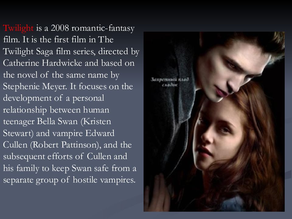 Twilight is a 2008 romantic-fantasy film. It is the first film in The Twilight Saga film series, directed by Catherine Hardwicke and based on the novel of the same name by Stephenie Meyer. It focuses on the development of a personal relationship between human teenager Bella Swan (Kristen Stewart) and vampire Edward Cullen (Robert Pattinson ), and the subsequent efforts of Cullen and his family to keep Swan safe from a separate group of hostile vampires.